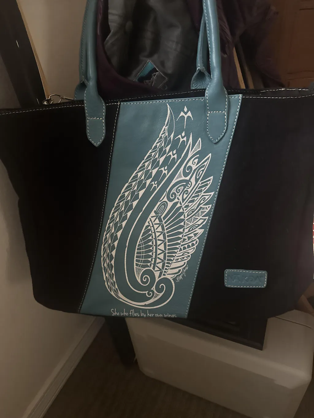 The tribal tattoo art by Megan Jones has been placed on the leather with a unique method that leaves the natural leather exposed and preserves the feel and finish of the genuine leather.